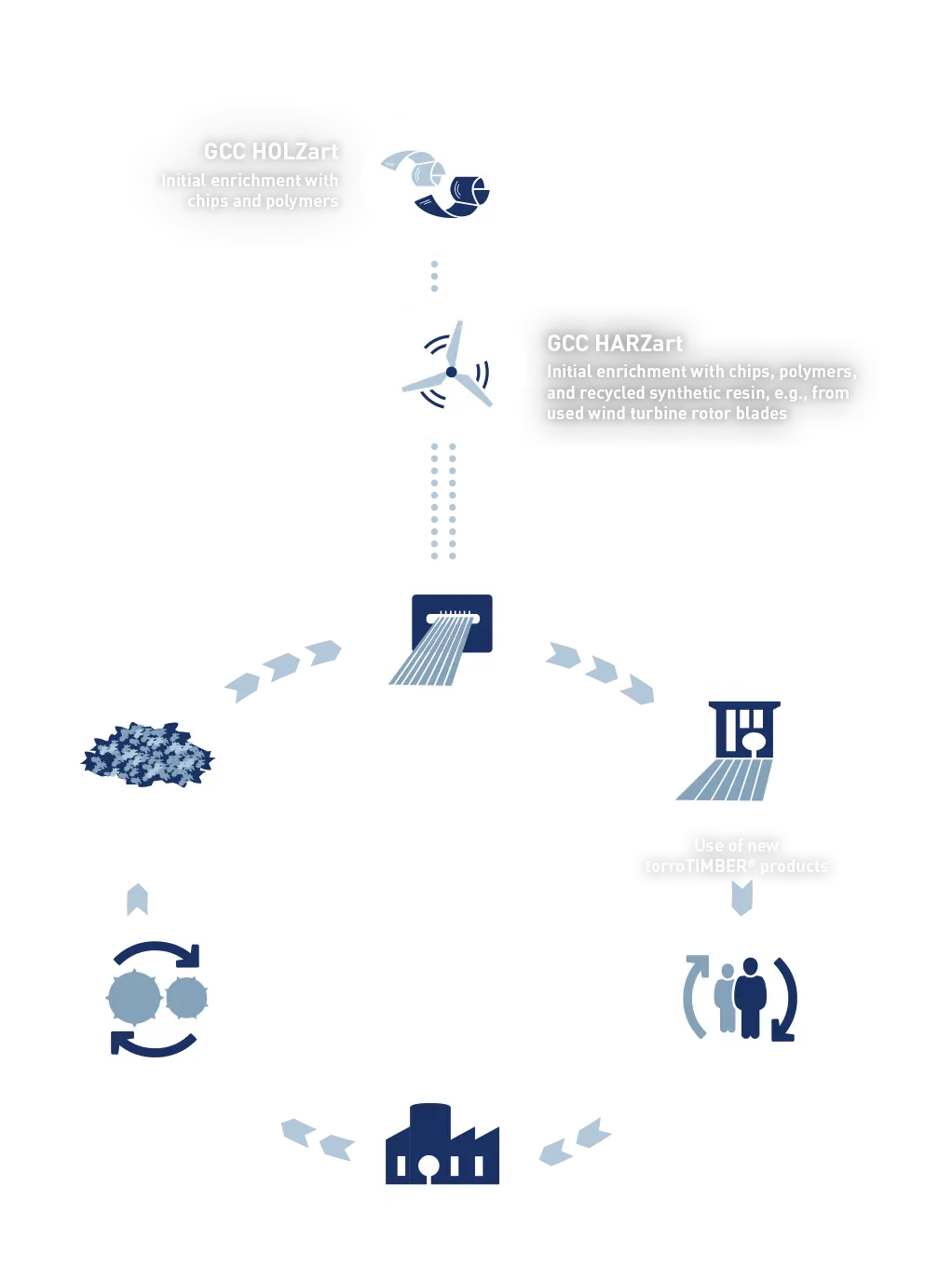Some of our products have recycled synthetic resin added to the material formulation. This material is produced, among other things, from end-of-life wind turbine rotor blades. This material version allows us to achieve very specific product properties while at the same time making us pioneers in the material recycling of rotor blades.