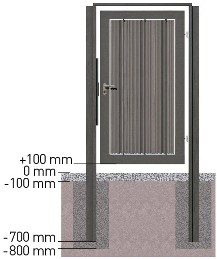 Fill the foundation hole with concrete to a depth of 100 mm. Position the frame in the foundation hole at a depth of -700 mm. Precisely apply the lower edge of the post with the aid of a small brick. Apply concrete into the foundation hole to a level of -100 mm. All posts must be vertically aligned.