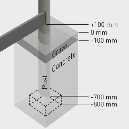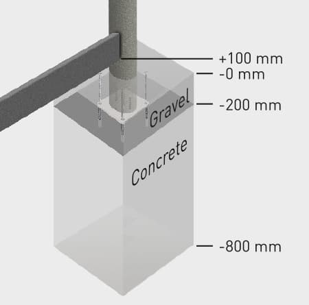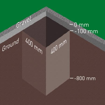 A separate, suitable foundation is required. For this purpose, dig all of the foundations holes (400 x 400 x 800 mm) and fill with concrete to a height of between -800 mm and -200 mm. Allow to fully harden. Alternatively, a suitable anchoring system can be installed on-site.