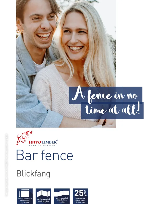 With the torroTIMBER® bar fence, you can upgrade your garden with a decorative boundary manufactured from innovative material. Adapt it to your garden requirements: Thanks to flexible connecting elements that can be utilised, the solid bars can be installed in various ways and at different heights. Matching doors and gates are also available on top as an optional design! The fixed anchoring of the post with the foundation means that the bar fence is equipped for all types of weather. Not only that: You don‘t need to worry about the posts rotting in the ground for 25 years – that‘s our guarantee!