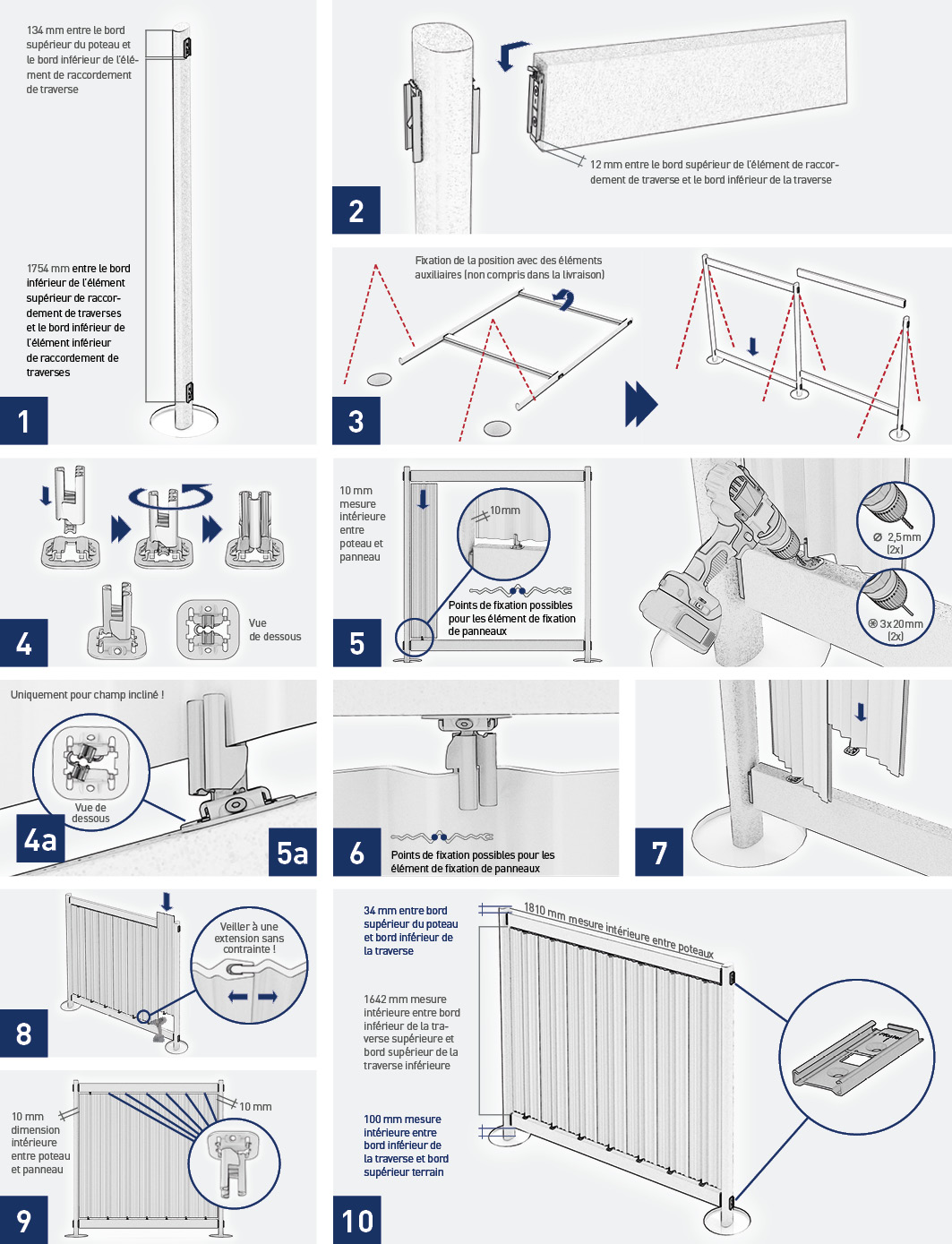 Fixer les supports de panneaux inférieurs selon les instructions (cf. point 5) Veiller à une dilatation du panneau sans contrainte. Terminer le dernier panneau à 10 mm du poteau.