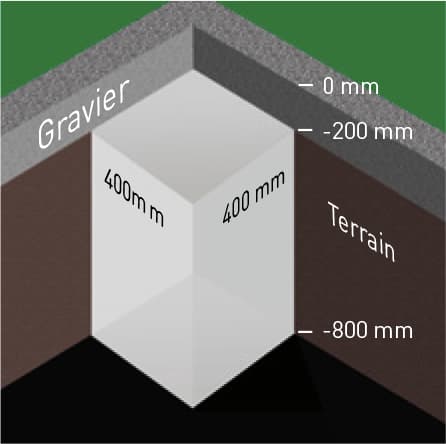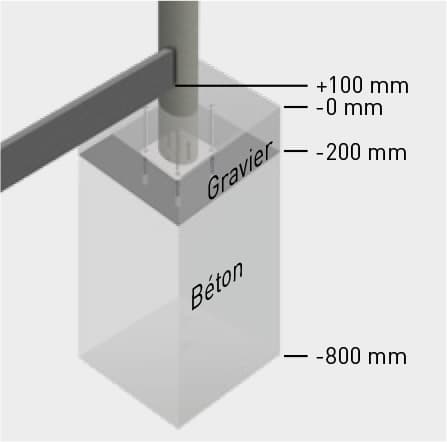 tous les trous des fondations (400 x 400 x 800 mm) et les remplir de béton coulé de -800 mm à -200 mm. Laisser durcir entièrement. En alternative, il faudra réaliser un système d’encrage approprié.