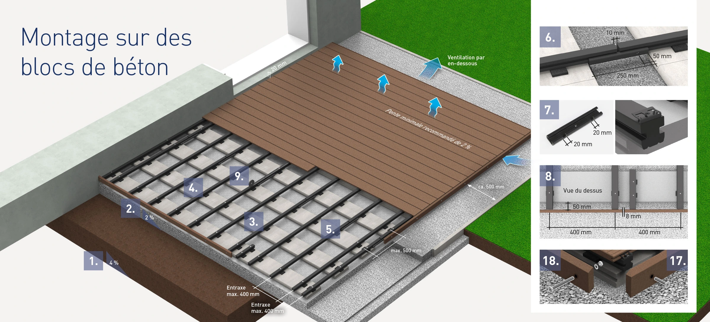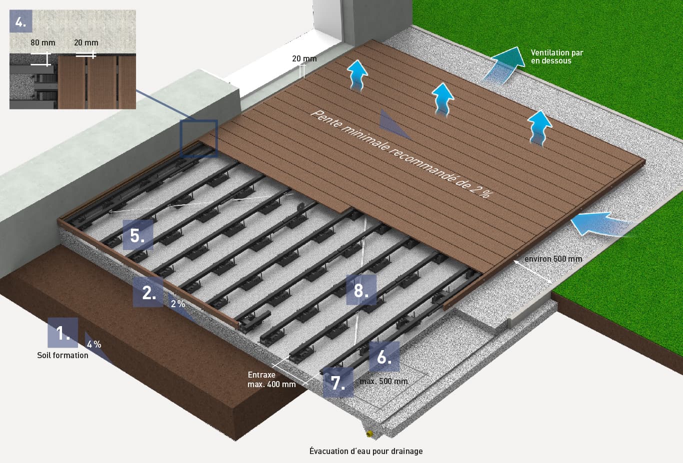 - Respectez les espacements minimaux nécessaires pour permettre à la construction de se dilater sans contraintes et de respirer suffisamment par en-dessous.