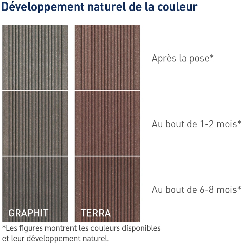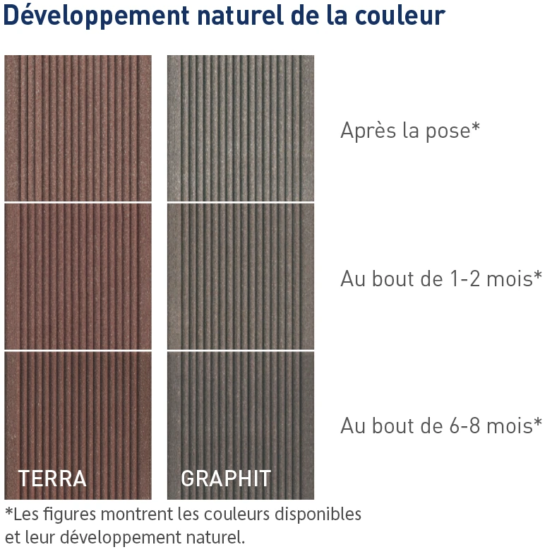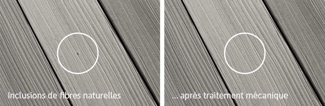 Votre terrasse doit avoir un aspect naturel - les petites inclusions de levure et de fibres naturelles en font partie. Celles-ci peuvent remonter à la surface au fil du temps si les lames de terrasse sont exposées aux intempéries et à l’humidité. Il n’y a pas lieu de s’inquiéter : avec le temps, ces particules disparaîtront presque d’elles-mêmes en raison de l’utilisation normale de la terrasse. Si vous souhaitez tout de même les enlever, vous pouvez facilement le faire mécaniquement sans endommager le matériau. Votre terrasse restera robuste et durable. Alors, profitez du grand air sur votre terrasse telle qu’elle est !