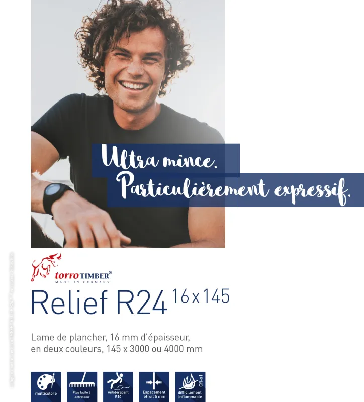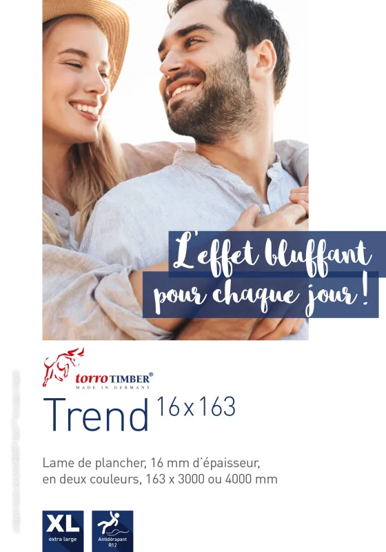 Une lame, de nombreuses possibilités. Du fait de ses caractéristiques modernes et tendance, notre lame Trend 16 x 163 large porte bien son nom. Elle peut être posée des deux côtés et elle est disponible en couleurs Terra et Graphit. Elle est finement striée d’un côté et rainurée de l’autre. Quel que soit le côté que vous choisirez, vous ne vous lasserez pas et serez longtemps satisfait de l’aspect de la surface robuste.