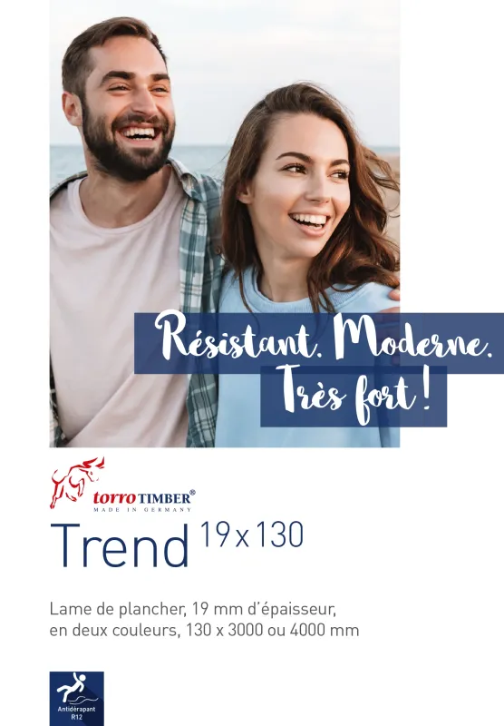 Avec ses 19 mm d’épaisseur, notre lame Trend 19x130 est vraiment forte. La lame a deux faces différentes. Une surface présente de fines stries et l’autre est rainurée. Les deux faces sont disponibles à la pose en couleur Terra ou Graphite. Les lames antidérapantes et dont la couleur reste stable dans le temps vous permettent de moderniser et d’améliorer la sécurité de votre espace extérieur !
