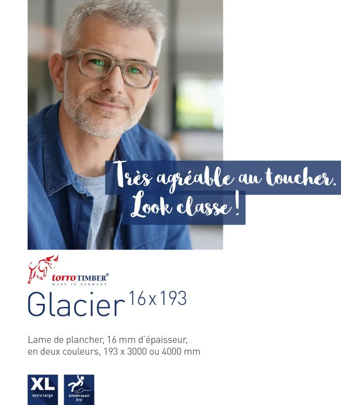 Les lames de la série Glacier se caractérisent par l’association de deux faces différentes. La lame Glacier 16 x 193 peut être posée des deux côtés – d’un côté sa surface présente des stries fines alors que l’autre côté est réalisé avec un effet bois brossé. Des textures aléatoires et fluides de bois brossé confèrent à la surface de la lame un agréable dynamisme optique. Les lames de plancher extra larges sont disponibles dans les couleurs Terra et Graphit et leur aspect est très tendance !