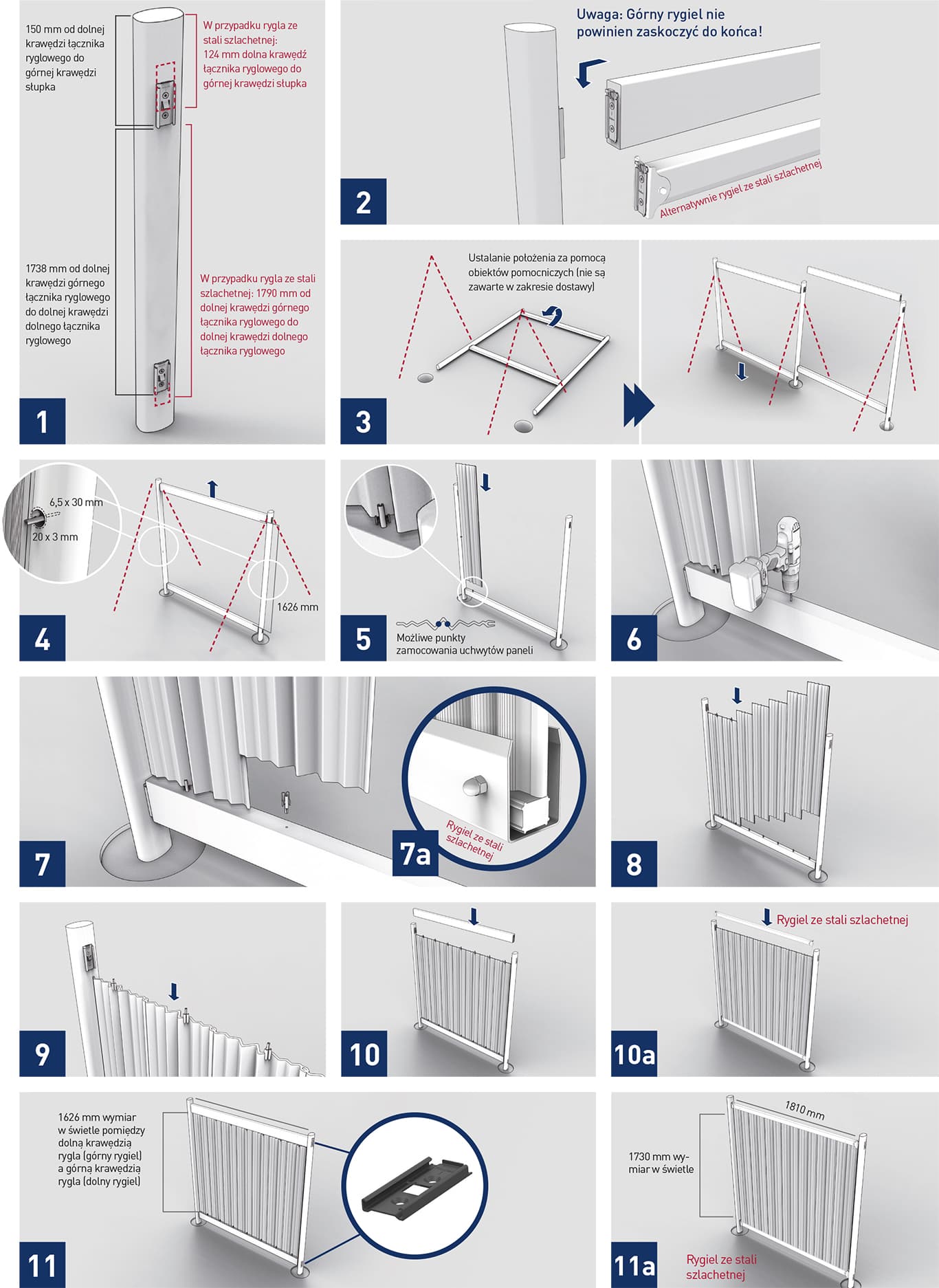 Zestaw dla jednego pola ogrodzenia zawiera: 2 rygle ze stali szlachetnej wraz z mocowaniem do słupka